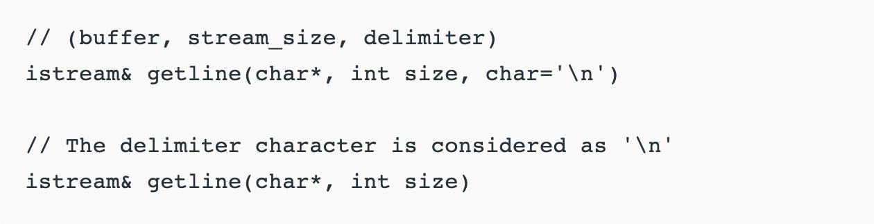 -> getline() 함수는 개행문자 혹은 maximum limit 를 만날때까지 입력을 받는다