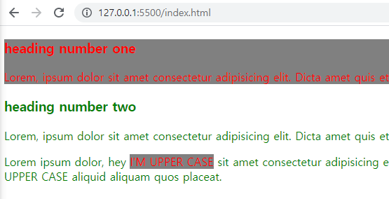 해당 문자열이 대문자가 됐고 red selector의 스타일대로 변경됐다.