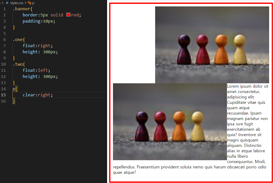 right는 clear되어서 <p>가 개행되서 나타나지만