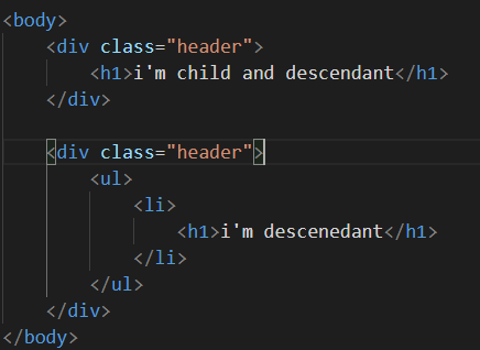 div > h1 {} : div를 부모로 갖는 h1 태그. (바로 상위 조상)