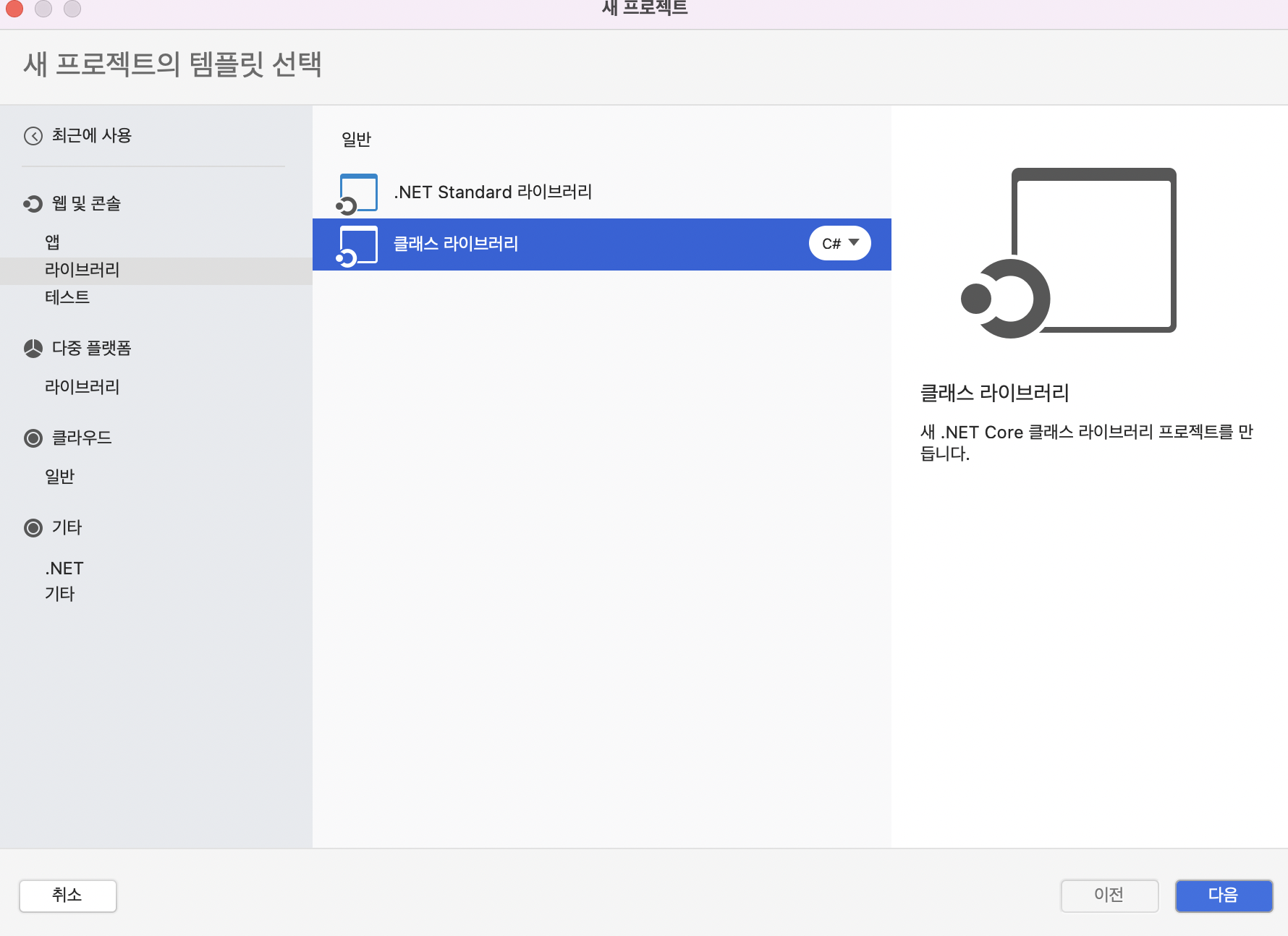 2. 앱 및 콘솔 -> 라이브러리 -> 클래스 라이브러리(c#)