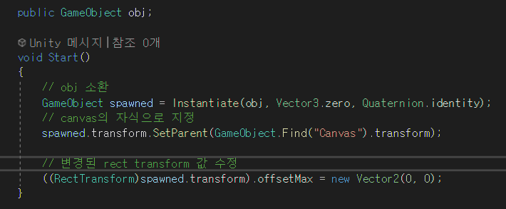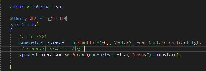 아니면 소환할 오브젝트를 프리팹화할때 canvas 자체를 프리팹으로 만들어도 되지만