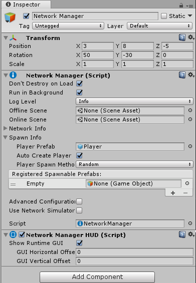 네트워크 사용위해서는 Game Object에 Network Manager 컴포넌트 추가.
