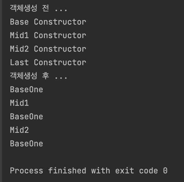 실행결과를 보면 Last 객체를 생성했을때 Base 클래스의 생성자가 1번만 호출됐다.