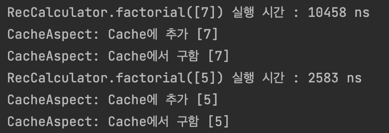 그렇기 때문에 첫 번째 cal.factorial(7)을 실행했을때는 실행시간과 캐시 추가했음이 출력되지만, 두 번째 에서는 실행시간이 출력되지 않은 것이다. (ExeTimeAspect가 실행되지 않았기 때문에)