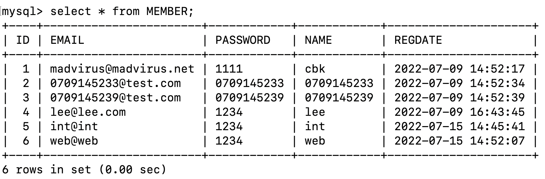 mysql 에서 MEMBER 테이블을 조회: