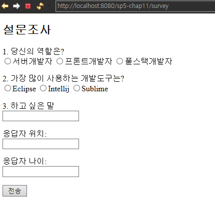 서버를 시작하고 "http://localhost:8080/sp5-chap11/survey" 로 가면 아래 화면이 나온다.
