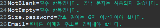 위의 오류 메시지들은 Bean Validation의 프로바이더 (hibernate-validator)가 기본 제공하는 에러 메시지들이다.