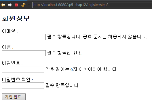 - 책에는 별도로 설정한 글로벌 범위 Validator()가 없을 때만이라고 되있는데 @InitBinder로 개별적으로 설정한 컨트롤러 범위의 Validator도 없어야 하는듯 하다. (생각해보면 당연하다)